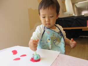 スポンジに絵の具をつけて、ポンポンポン♪