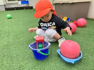 バケツにボールを入れてどこ行くの~?