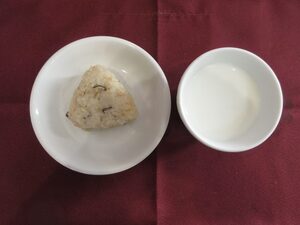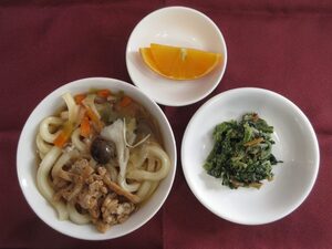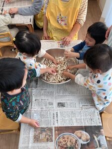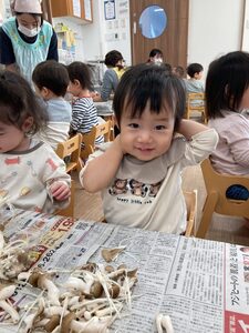 お友だちがほぐしてくれたきのこは、お昼のうどんとおやつのおにぎりでいただきましたよ♪
