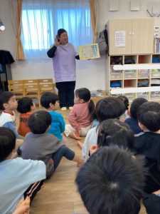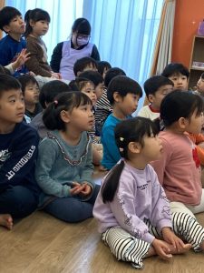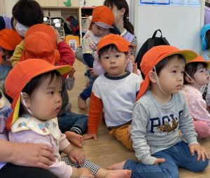 大雨にまつわる紙芝居を真剣に見るお友だち♪