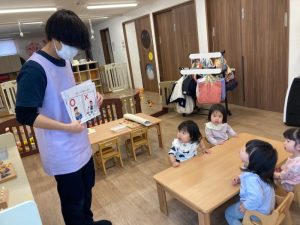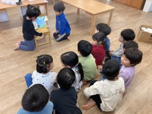 かける組さん、今日もかわいい先生たちが絵本を読んでくれてますね!(^^)!
