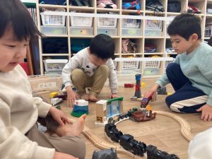 つばさ組さんは、かける組のお兄さんと電車遊びを楽しんでますね🚃